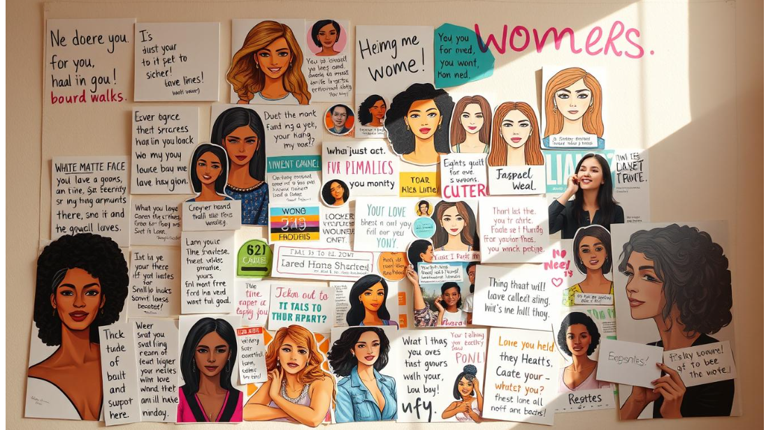 A vibrant and inspirational vision board showcasing empowering imagery for women. Crisp, well-lit photography captures a collage of diverse female faces, motivational quotes, and symbols of strength and success. The foreground features a collection of handwritten affirmations, personal goals, and aspirations, artfully arranged against a soft, neutral backdrop. Warm, natural lighting bathes the scene, creating a sense of positivity and self-actualization. The middle ground presents a mix of magazine cutouts, colorful stickers, and hand-drawn illustrations, all reflecting themes of financial independence, career achievement, and personal growth. The background subtly incorporates ethereal, pastel-tinted textures, framing the vision board with a dreamlike, empowering atmosphere.