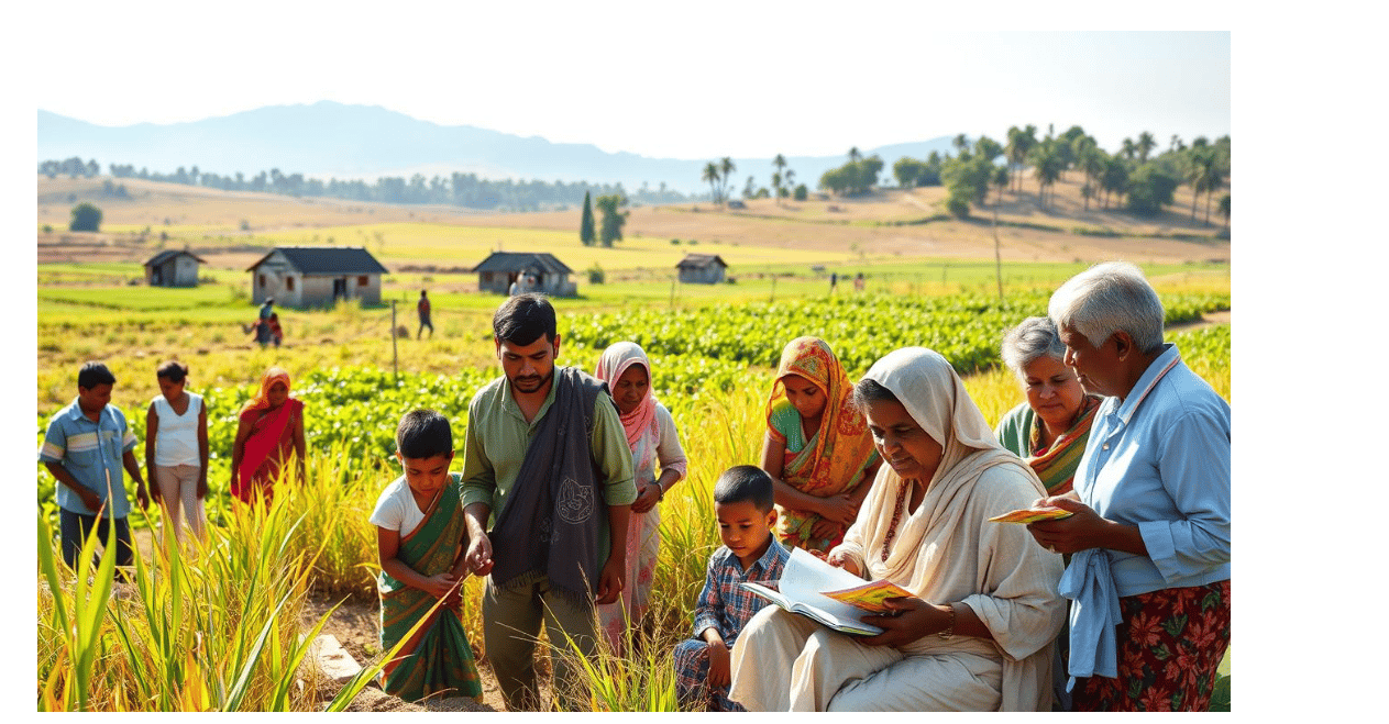 A serene landscape depicting a rural community coming together to build homes, with diverse individuals working alongside volunteers in a bright, sunny environment. In the background, a simple yet dignified image of a small farm with healthy crops, symbolizing sustainable agriculture and hope for the future. The scene is filled with warmth and unity, showcasing efforts in education and healthcare, represented by children reading books and elderly people receiving care.